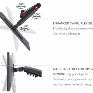 Hawk Single Monitor Arm effortlessly elevate your monitors to eye level, reducing neck and eye strain for a more ergonomic way to work. Featuring 360-degree rotation capability, enhanced swivel flexibility, and effortless tilting, Hawk makes it easy to share screens with clients and colleagues, or to simply achieve a comfortable setup that’s tailored to your body.