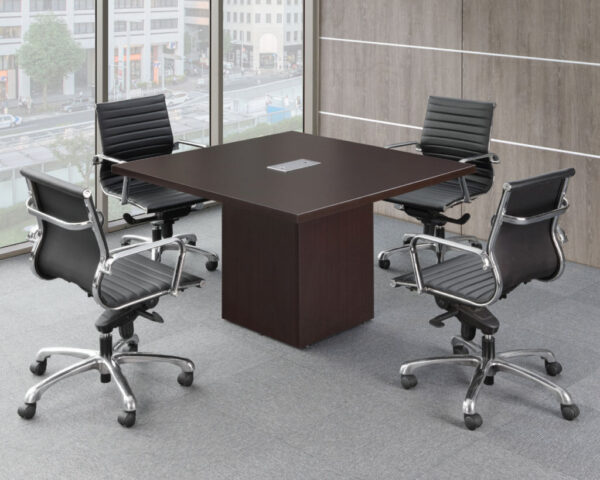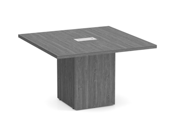 • Square-Edge Conference Table featuring grommets for seamless wire management, while the cube base discreetly organizes power and data cables.